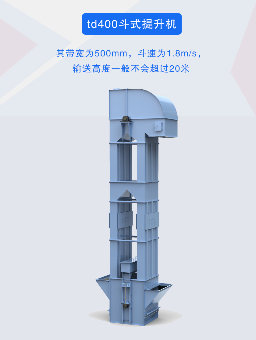td400斗式提升機牽引件為橡膠帶,斗寬為400mm,帶寬為500mm,斗速為1.8m/s,提升高度達80米.提升量每小時可達24-66立方,可根據(jù)用戶要求選擇碳鋼和不銹鋼材質(zhì).