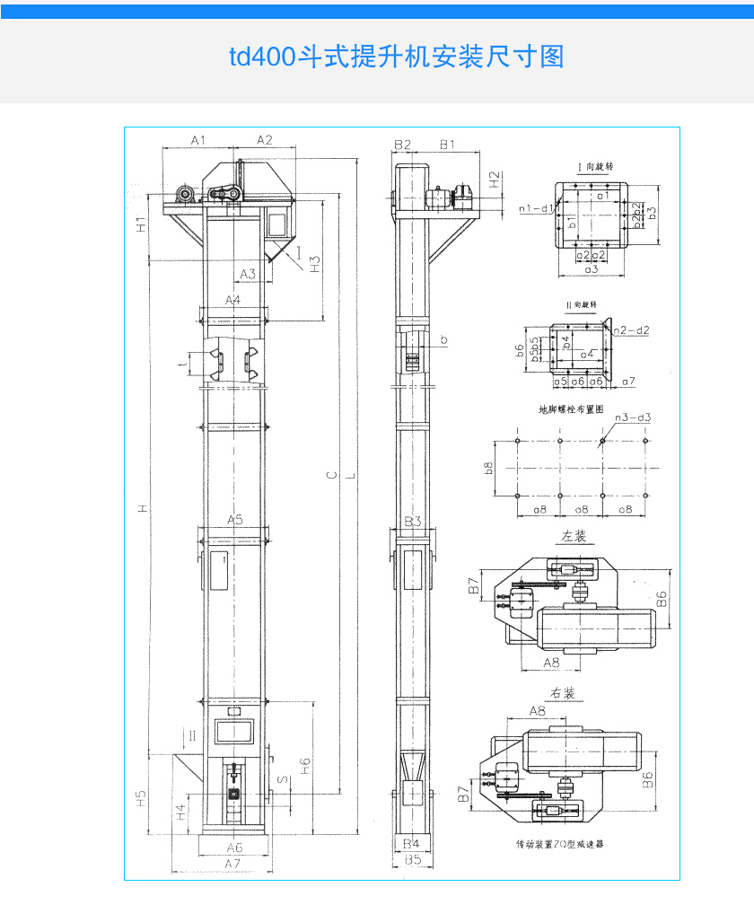 td400斗式提升機由運行部分(料斗與牽引膠帶),帶有傳動滾筒的上部區(qū)段,帶有拉緊滾筒的下部區(qū)段,中間機殼,驅(qū)動裝置,逆止制動裝置等組成,傳動裝置有兩種形式,分別配有YZ型減速器、ZQ(或YY)型減速器,YZ型軸減速器直接是安裝在主軸軸頭上,省去了提升機傳動平臺、聯(lián)軸器等,結構更為緊湊,重量輕,內(nèi)部安裝有異型逆止器,逆止可靠。