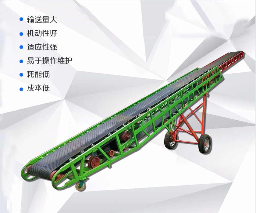 移動式皮帶輸送機是在普通皮帶輸送機底部安裝移動輪,大、小行走輪采用實心膠輪,防止壓碎糧食及倉庫地面,可以根據物料的堆放位置隨意移動,人工即可推動出入倉庫,主要用于裝卸地方變動的場合,如:砂石料場、建筑工地、煤場等。移動式皮帶輸送機有電動和手動升降兩種類型,具有快、慢兩種速度,以適應散運、包裝的不同要求。可以單臺或多臺串聯使用,也可與其他設備配套使用,具有輸送量大、機動性好、適應性強、易于操作維護、耗能低、成本低等特點。