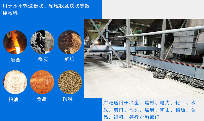 水平刮板輸送機廣泛適用于冶金、建材、電力、化工、水泥、港口、碼頭、煤炭、礦山、糧油、食品、飼料、等行業和部門,主要用于水平輸送粉狀、顆粒狀及塊狀等散裝物料。