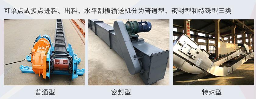 水平刮板輸送機是指水平方向上輸送粉狀及顆粒狀物料的設備,可單點或多點進料、出料,水平刮板輸送機分為普通型、密封型和特殊型三類,與普通型水平刮板輸送機相比,密封型刮板輸送機可用于浸出油廠輸送含有易揮發、易滲溶劑的物料以及易燃易爆的物料。特殊型有雙層刮板、油刮板、通風刮板等。