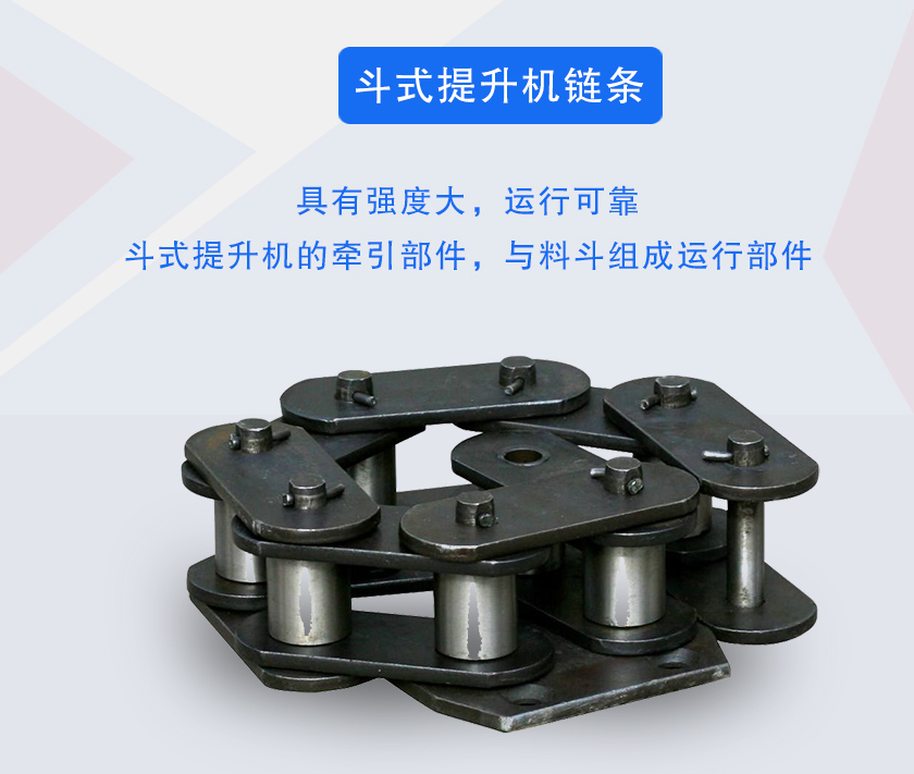斗式提升機鏈條是斗式提升機的牽引部件,與料斗組成運行部件,具有強度大,運行可靠的特點。