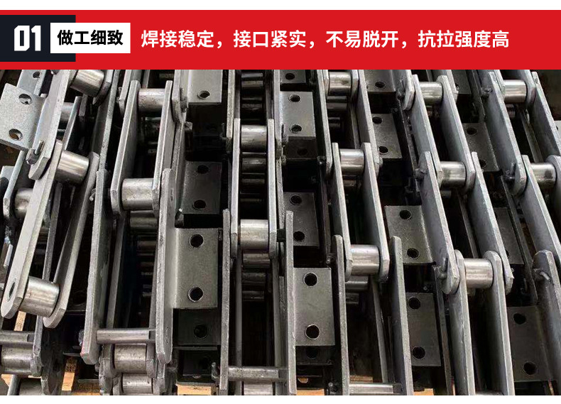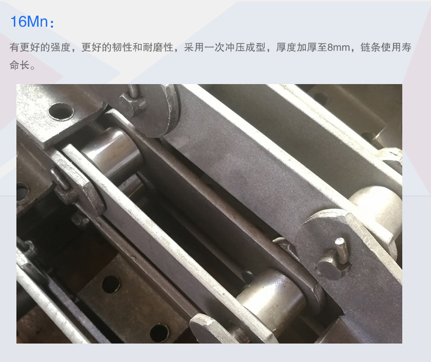16Mn:有更好的強度,更好的韌性和耐磨性,采用一次沖壓成型,厚度加厚至8mm,鏈條使用壽命長。