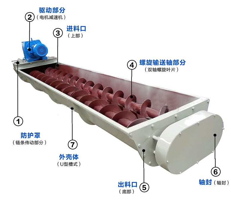 雙軸螺旋輸送機(jī)安裝有兩根螺旋軸,一根左旋,一根右旋。兩根螺旋軸轉(zhuǎn)向不同方向,依靠螺旋葉片推動(dòng)物料前進(jìn),雙軸之間的物料處于螺旋葉片之間。來回交替旋轉(zhuǎn)和輸送,可避免物料堆積造成的物料堵塞現(xiàn)象。
