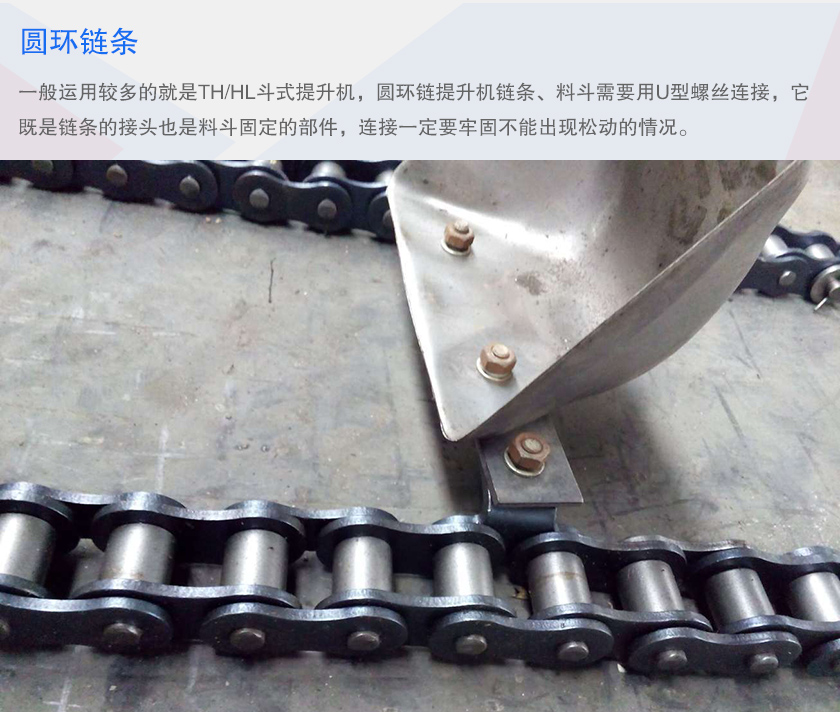 斗式提升機圓環鏈條一般運用較多的就是TH斗式提升機,圓環鏈提升機鏈條、料斗需要用U型螺絲連接,它既是鏈條的接頭也是料斗固定的部件,連接一定要牢固不能出現松動的情況。