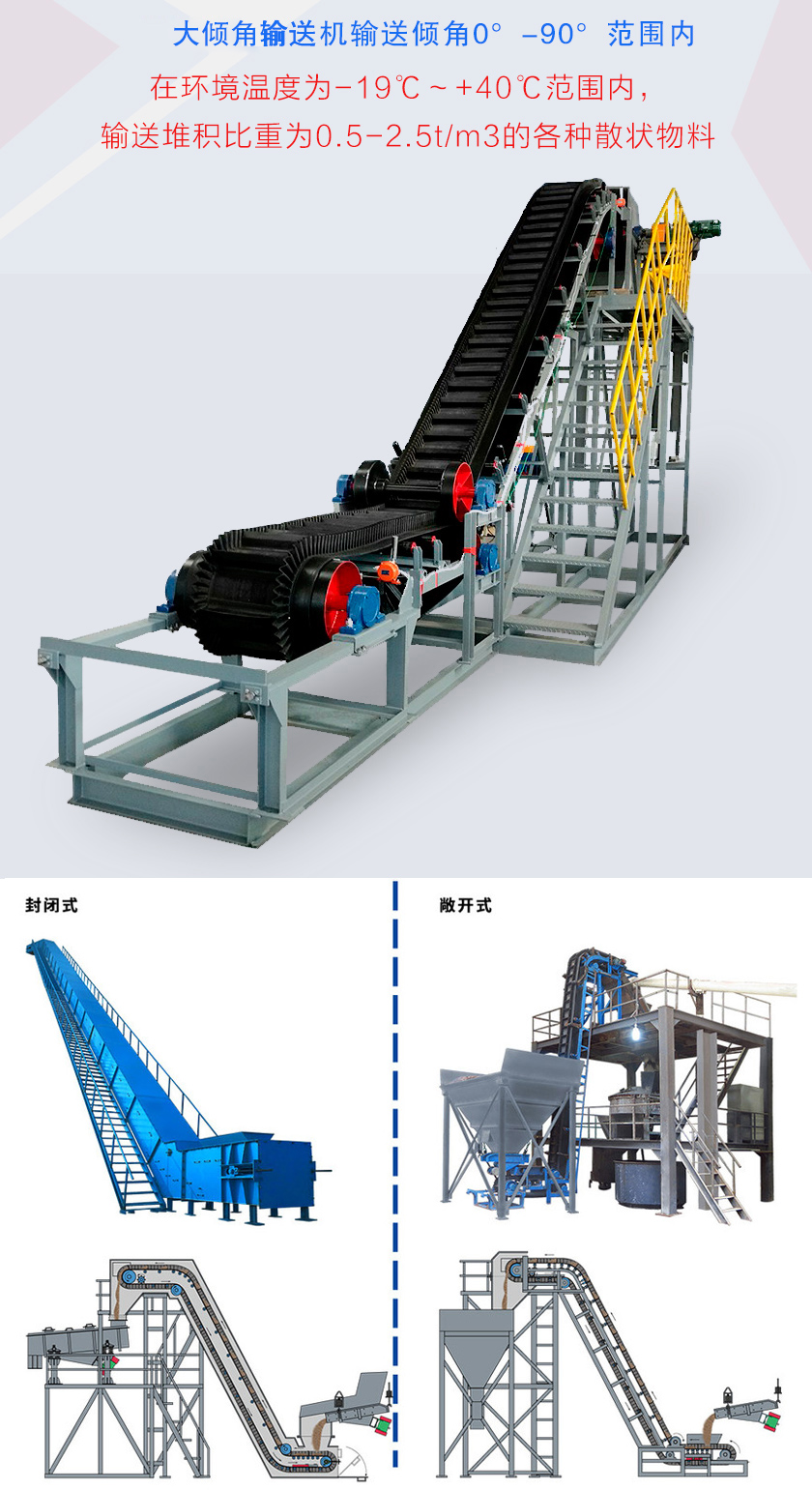 1、可大傾角輸送散狀物料,可節省大量設備占地面積,徹底解決普通皮帶輸送機無法達到的輸送角度,可以30度-90度范圍內輸送。