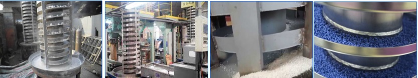 垂直振動提升機由垂直螺旋槽、兩個振動電機、減震系統和底架等組成,根據雙振動電機的自同步原理,振動電機產生激振力,迫使整個輸送塔體進行水平圓周運動和向上垂直運動的空間復合振動,螺旋槽內的物料受輸送槽的影響,作勻速圓周拋擲運動,沿輸送槽向上運動,完成物料的向上(或向下)輸送。