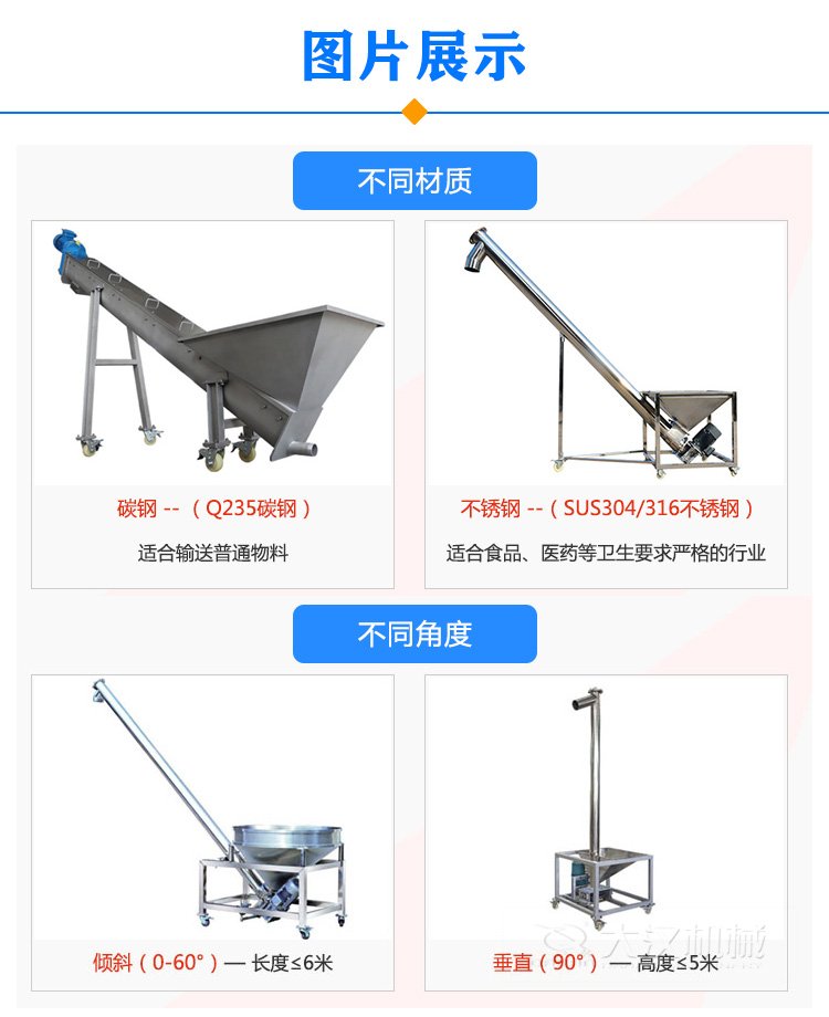 2、0-60°大傾角輸送,能同時輸送和提升物料,適合與料斗、料倉或筒倉連接。