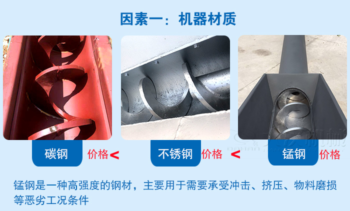 無軸螺旋輸送機的材質主要有:碳鋼、不銹鋼、錳鋼等三種,其價格高低為:碳鋼<不銹鋼<錳鋼,其中錳鋼是一種高強度的鋼材,主要用于需要承受沖擊、擠壓、物料磨損等惡劣工況條件,所以價格相比其他材質會好一些。