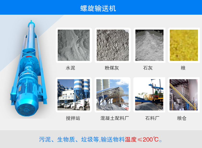 螺旋輸送機可以輸送可以水平,傾斜或垂直輸送粉狀,顆粒狀及小塊狀物料,同時具備混合、攪拌、冷卻功能,有軸螺旋輸送機可以無粘性的干粉物料和小顆粒物料.(例如:水泥、粉煤灰、石灰、糧等),無軸螺旋輸送機適合輸送機由粘性的和易纏繞的物料。(例如:污泥、生物質、垃圾等,輸送物料溫度≤200℃。螺旋輸送機適用于攪拌站,水泥廠、混凝土配料廠,石料廠,糧倉等場合。