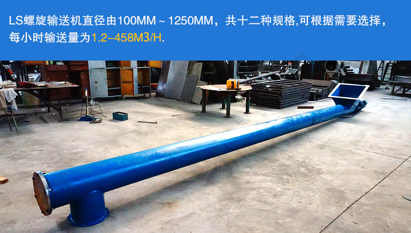 LS螺旋輸送機直徑由100mm~1250mm,共十二種規格,分為單驅動和雙驅動兩種形式,單驅動螺旋機長度可達40m(特大型30m),雙驅動螺旋機采用中間斷開軸結構,長度可達80m(特大型60m),螺旋機長度每 0.5m 一檔,可根據需要選擇,每小時輸送量為1.2-458m³/h.