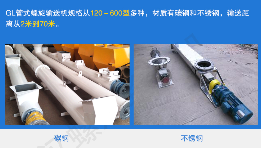 GL管式螺旋輸送機規格從120-600型多種,材質有碳鋼和不銹鋼,輸送距離從2米到70米。